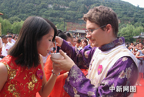 八月二十六日,陕西西安首届华清池七夕中华情人节上,近百对有情人身着唐服,举行唐代宫廷婚礼,由“唐明皇”和“杨贵妃”见证爱情。图为来自英国的新郎常武飞喂他的西安新娘吃饺子。作者 冽玮