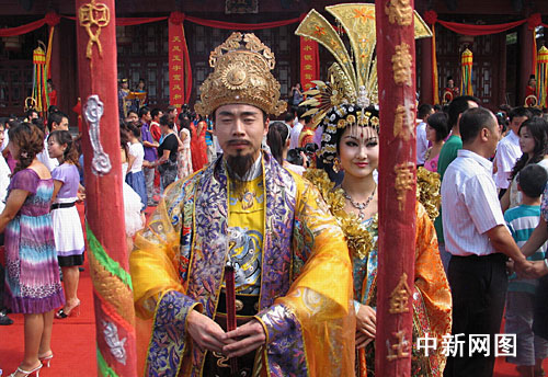 八月二十六日,陕西西安首届华清池七夕中华情人节上,近百对有情人身着唐服,举行唐代宫廷婚礼,由“唐明皇”和“杨贵妃”见证爱情。图为皇帝带领新人焚香盟誓。冽玮 摄