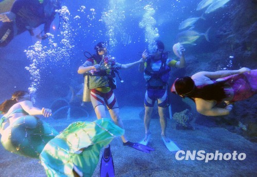 8月26日,一对情侣潜入福州海底世界,在充满童话色彩的“美人鱼”及五彩缤纷海洋鱼儿的见证下互赠鲜花、“爱心”礼物,共度七夕情人节浪漫时光。中新社发 刘可耕 摄