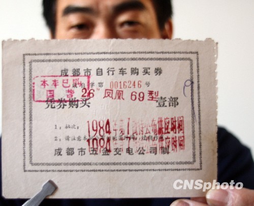 2009年8月26日,山东滨州收藏者展示一张在1984年使用过的、珍贵且完好自行车购买券,该券系成都市五金交电公司制,标有“成自字第0016246号”、“本车已购国营”、“凭券购买”、“‘26’凤凰69型”、“1984年第7批待公布供应时间”等字样。在上个世纪七八十年代,由于市场供不应求——被称为“三大件”的缝纫机、手表、自行车更是紧缺,这类商品只有凭借票证才能够购买。其中,“自行车票”是每年按单位职工人数比例配给的。中新社发 郭志华 摄