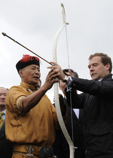 图:梅德韦杰夫蒙古草原弯弓射箭试身手 (2)