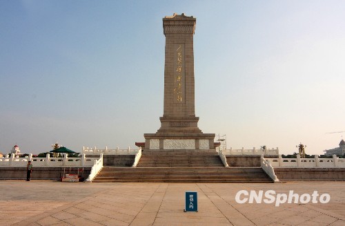 8月26日,人民英雄纪念碑全面清洗工作结束,经过物理方式全面清洗的人民英雄纪念碑以“金字更闪、碑体更亮”的全新面貌亮相,迎接国庆六十周年。中新社发 吴芒子 摄