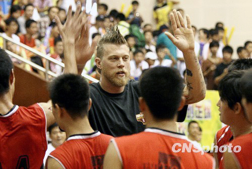 8月26日上午,随“NBA FIT 篮球训练营”来到中国的NBA丹佛掘金队球星克里斯·安德森 (Chris·Andersen),在广东汕头与青少年球迷亲密交流,指导当地两支青少年球队进行对抗赛,吸引了众多篮球爱好者蜂拥而至。中新社发 郭海 摄
