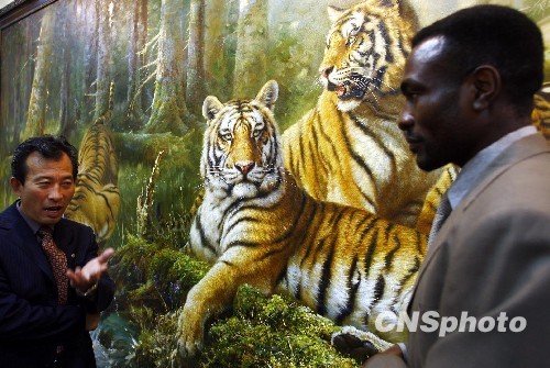 朝鲜人民艺术家朴孝成油画精品《长白山之虎》成为展品中的焦点。中新社发 郑雄增 摄