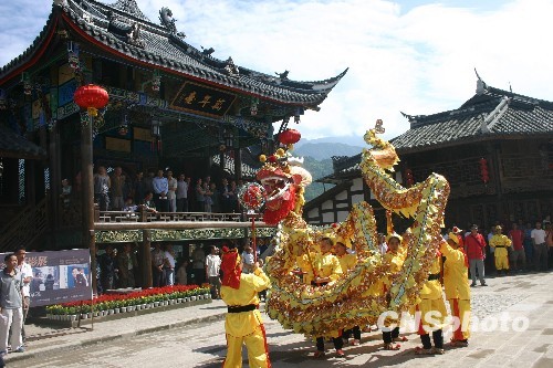 8月27日,阳光照耀着拥有上百年历史的汶川县水磨镇禅寿老街,在古戏台外,水磨镇的民众耍起了龙灯庆祝老街的“复活”,在“五一二”汶川特大地震中,禅寿老街受到严重毁损。在广东省佛山市的援建下,老街比以往更具活力。中新社发 霍潺 摄