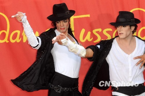 图为迈克尔的模仿者朱比·罗杰斯(右)在蜡像前以假乱真。中新社发 张炜 摄