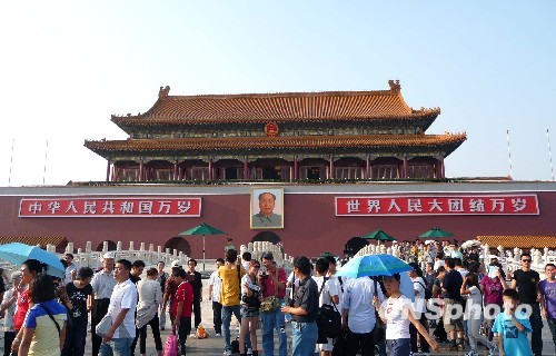 2009年8月26日,粉刷修缮后的天安门城楼焕然一新,引得中外游客纷纷驻足观赏、拍照留影。