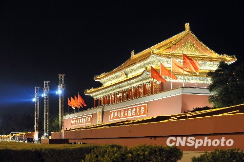 图为北京天安门国庆庆典演练前,天安门城楼前搭建临时灯塔。中新社发 金硕 摄