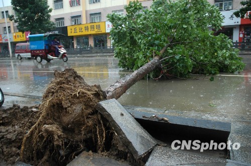 8月29日,河南淮阳路旁的行道树被大风连根拔起。当日凌晨,河南省淮阳县遭遇大风暴雨,街道上一些行道树被大风连根拔起,街两旁商店的广告牌也被揭掉。气温明显下降,市民出行都穿上了厚厚的秋装。