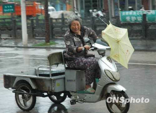 一位老人打着雨伞,顶着风雨骑车艰难地穿行在街头。 中新社发 杨正华 摄