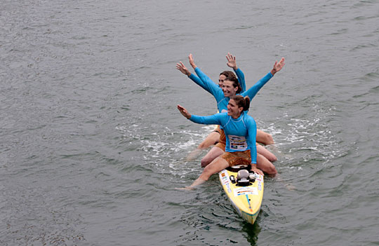 图为在冲浪板上航行的三位女杰。