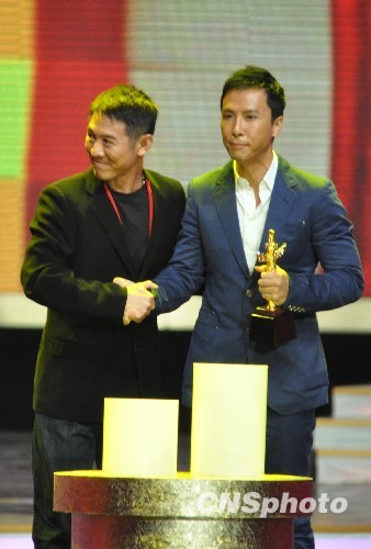 图为图为李连杰为甄子丹颁发优秀境外华裔男演员奖。中新社发 李学仕 摄