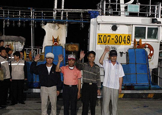 8月29日下午,朝鲜方面在东部海域的分界线附近向韩国移交了因非法越界被朝鲜扣留将近一个月的韩国渔船和船上4名渔民。