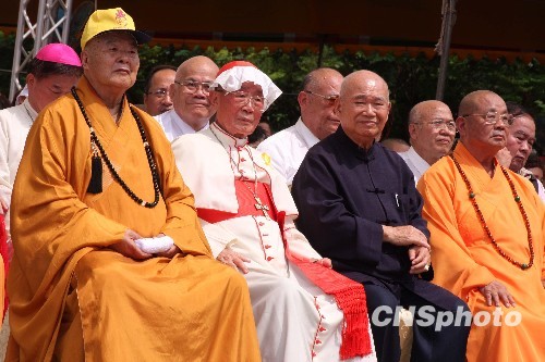 佛光山星云大师(左一)等台湾宗教界领袖以及各界人士数千人,冒着烈日与会,共同悼念灾区罹难者,为生还者祈福。中新社发 董会峰 摄