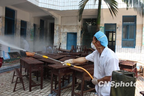 8月30日上午,四川长宁县县卫生系统迅速组织力量,对全县受灾区域进行防疫消洒,确保广大人民群众的健康安全。中新社发 曾朗 摄