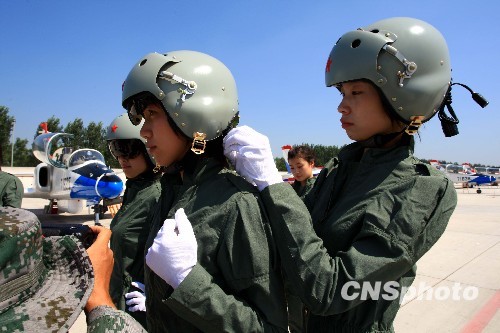 中国空军首批歼击机女飞行员更换新型飞行装具。中新社发 张雷 摄