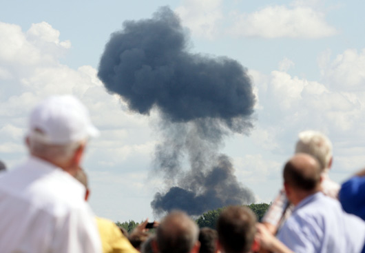 8月30日,在波兰中部城市拉多姆的航空展上,白俄罗斯一架苏-27战斗机在进行飞行表演时坠毁,机上两名飞行员死亡。图为观众观看远处坠机腾起的浓烟。