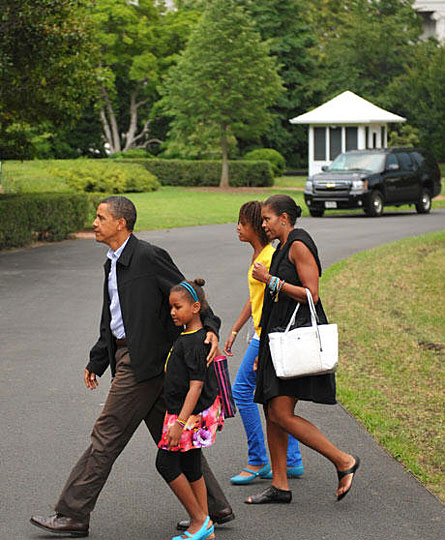 图为美国总统奥巴马(左一)在华盛顿白宫南草坪上向人们挥手。