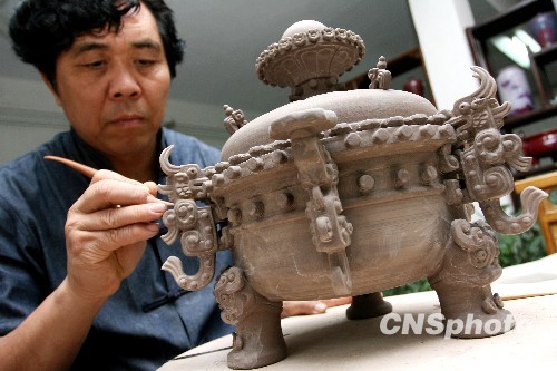 中国工艺美术大师孔相卿在河南禹州孔家钧窑创作《鼎盛华夏》。中新社发 牛书培 摄