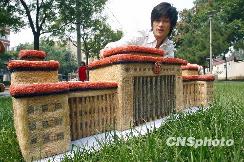 为迎接新中国60华诞,四川青年理发师黄鑫历时3个多月、用5.5公斤碎头发制作了一个微型“人民大会堂”,与之前制作完成的“人民英雄纪念碑”、“天安门”等组成一个头发丝版“天安门广场”景观缩影。