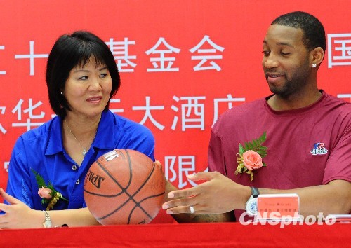 8月31日下午,美国NBA休斯顿火箭队著名球星麦克格雷迪(右)与中国著名排球教练郎平共同出席“温暖中国行动公益之旅”启动仪式,麦蒂将慈善签名篮球传递给郎平。本次公益活动由中国红十字基金会和美国体育公司共同发起主办,旨在帮助中国的癌症患者。中新社发 侯宇 摄