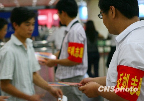 8月31日,一名反扒志愿者在北京西站向旅客分发反扒信息传单。中新社发 苏丹 摄