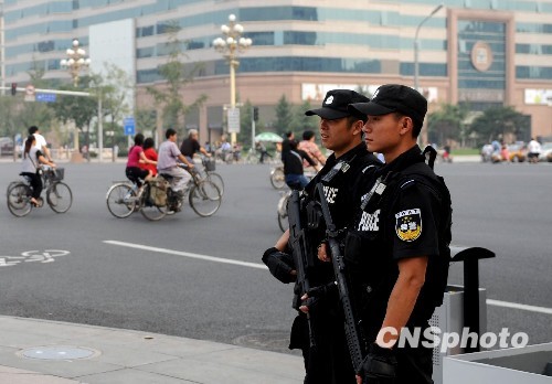 8月31日,特警在北京长安街西单街口站岗值勤,随着国庆节的到来北京长安街的警力得以加强。中新社发 廖攀 摄