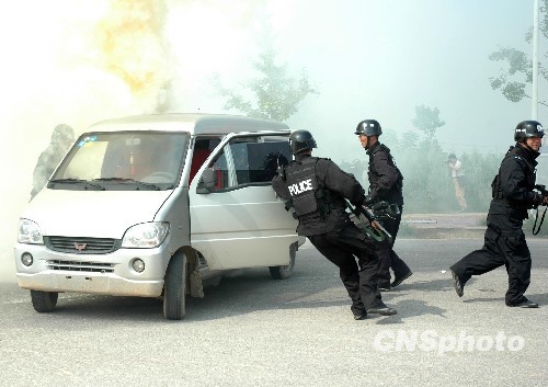8月31日,陕西咸阳进行国庆60周年安保工作现场演练,并举行誓师动员大会,确保为建国60周年大庆活动创造安全、稳定的社会环境。中新社发 赵钊 摄