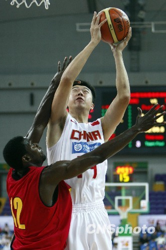8月31日,在江苏昆山举行的斯坦科维奇杯篮球赛上,中国国家男篮以58比50的比分战胜安哥拉队,获得第三名。图为王治郅上篮。中新社发 杜洋 摄