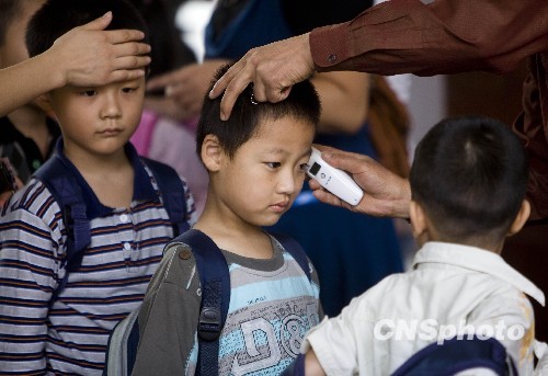 9月1日,河南洛阳实验小学的老师在校门口对一年级新生逐一检查体温。当日,中小学校新学年全面开课,洛阳市教育局要求每个学校在第一堂健康教育课上,教师要讲解甲型H1N1流感防控知识;各级各类学校、托幼机构和教育培训机构要落实晨检、午检和缺课、缺勤学生追踪制度;密切关注新学年开学返校学生的健康情况,加强对学生甲型流感防控知识的宣传教育。中新社发 张晓理 摄