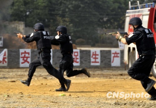 9月1日,四川举行“天府2009-南充”省级反恐应急处置演习。演习以四川南充市为主体,川东北片区的遂宁、广安、达州、巴中四市联动,假想某化工厂油气设施遭恐怖袭击引发连环爆炸和液化气泄漏的重大险情。南充市消防、公安、安监、交通、反恐等20多个部门人员以及遂宁、广安、达州、巴中四市应急力量共100多台车、1300余人,分别进行了抓捕、灭火、堵漏、防化、救治伤员、人员疏散等项目的演练。