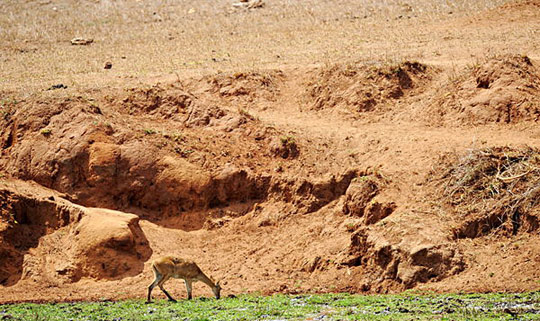 由于连续数月缺乏降雨,肯尼亚平日茂盛的草原日渐衰败,导致食物及饮水短缺,各动物保护区内的野生动物大批死亡。图为肯尼亚南部察沃国家公园里,一只羚羊在干涸的河边吃草。