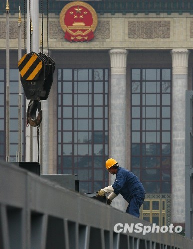 60周年国庆将至,天安门广场开始进行各种设备的吊装布置,广场上呈现一片忙碌的景象。图为9月2日,工人们正在进行电子显示屏和花盆架的吊装。中新社发 苏丹 摄