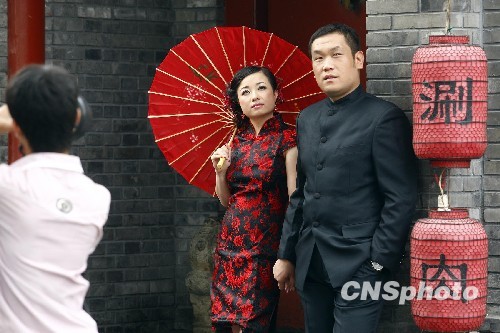 9月3日,一对新人在什刹海胡同里拍摄婚纱照,吸引不少游客的目光。随着国庆临近,北京胡同迎来“十一”旅游热潮,中外游客后海体验老北京风情。中新社发 郑雄增 摄