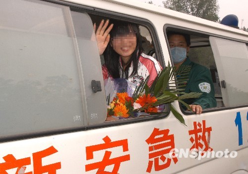 9月3日,在新安县第一人民医院治疗的该县第三高级中学1名甲型H1N1流感确诊患者出院乘坐专车返家。当日,首批确诊的80名甲型H1N1流感病例中的31名患者经过治疗获准出院,他们是分别在河南省新安县5所医院隔离治疗的,已经连续停药三天没有出现发热症状,且流感样症状消失,经甲型H1N1流感核酸检测呈阴性,按照卫生部制定的治愈标准,准许出院。倍受社会关注的新安县第三高级中学甲型H1N1流感疫情已得到有效控制。据悉,这31名患者出院后,将居家医学观察,医生还将进行随访。目前仍在隔离区内治疗的患者病情稳定,无重症病人。中新社发 何仁 摄