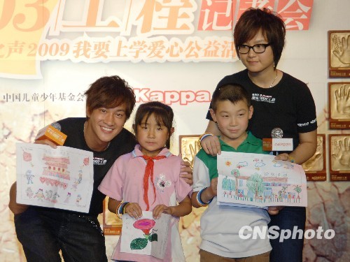 图为河北省丰宁满族自治县邓栅子小学小朋友东楠和王涛为何润东、周笔畅送上亲手绘的图画。中新社发 李学仕 摄