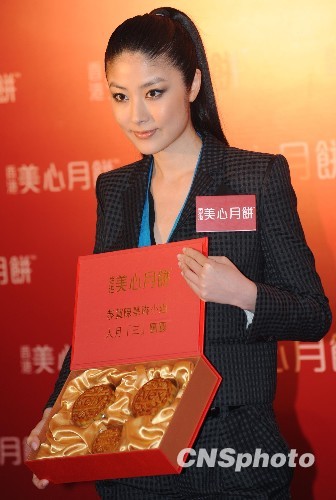 九月三日,香港艺人陈慧琳出席代言某品牌月饼新闻发布会,更获赠一盒特制月饼,饼面分别刻上她与丈夫及儿子的名字,寓意“人月三团圆”。中新社发 邓庆乐 摄