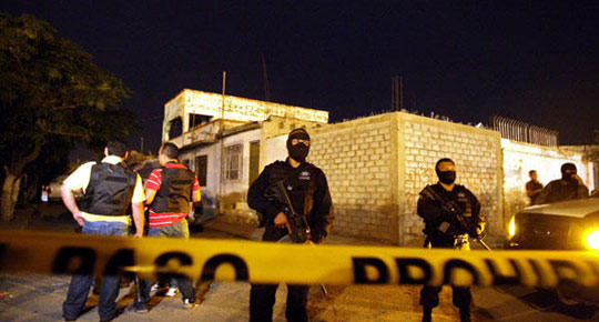 当地时间9月2日,一群持枪歹徒冲进位于墨西哥边境城市华雷斯市的一家戒毒诊所,打死18人,打伤5人。图为警察在戒毒诊所外警戒。