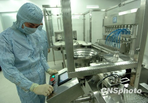 9月3日,技术人员正在生产线观察甲型H1N1流感疫苗的罐封状况。当日,浙江唯一具备流行流感疫苗生产资质的企业,浙江天元生物药业有限公司研制生产的首批20万人份甲型H1N1流感注射疫苗下线入库。中新社发 施健学 摄