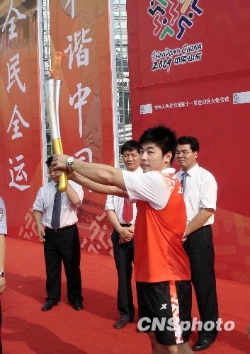 9月4日上午九时,以 “祝福祖国,共享全运”为主题的第十一届全国运动会火炬传递活动在广西首府南宁五象广场举行。第十一届全运会将于十月十六日在山东省开幕。中新社发 黄艳梅 摄
