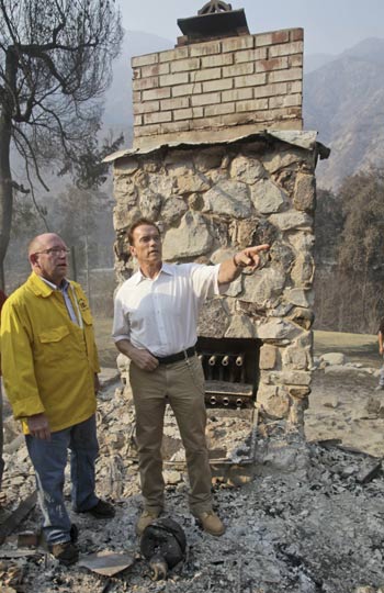 9月3日,加州州长施瓦辛格探访了洛杉矶市图洪加附近被火灾烧毁的地区。