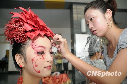 9月4日,浙江纺织服装职业技术学院举行了一场与众不同的2010届顶岗实习专场招聘会,招聘会上许多企业拒收了学生的简历,转而要求学生在现场展示专业技术能力。图为该院艺术与设计学院大三学生在招聘会现场向用人单位展示人物形象设计的专业技术能力。中新社发 徐小勇 摄