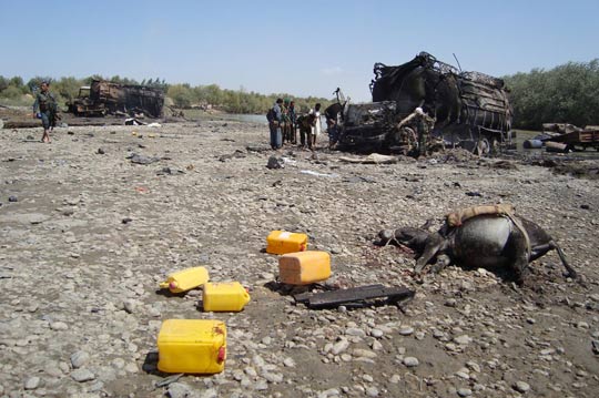 图:阿富汗塔利班分子劫持油罐车遭空袭(2)