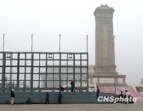 2009年9月4日,北京天安门广场,施工人员正在加紧搭建迎国庆巨型标语牌和花坛架,钢梁主体结构已基本完成。 中新社发 玉龙 摄