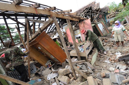 印尼西爪哇省强烈地震已经造成65人丧生。仍有数十人失踪,印尼方面官员表示,找到幸存者的机会渺茫。目前统计,已有超过8万7千栋房屋被毁。约有2万8千人无家可归,急需临时住所。图为9月4日,印尼民众正在废墟中寻找自己的物品。