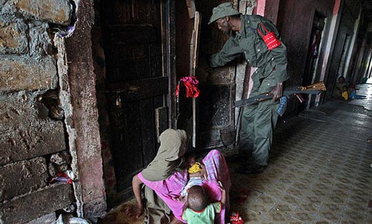9月5日,索马里安全部队在摩加迪沙展开搜查非法武器的行动,图为一名索马里女子与孩子正在望着前来搜查非法武器的士兵。