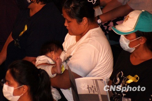 9月7日,“88水灾”追悼大会在高雄市巨蛋举行,包括灾民在内的各界代表约5000人出席。图为现场一名女性灾民怀抱幼子,神情落寞。中新社发 董会峰 摄