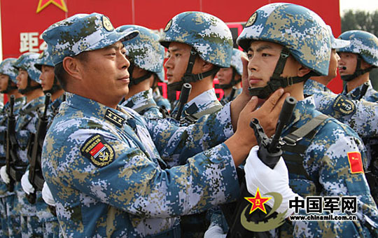 曾被海军授予“海军陆战队猛虎连”连长赵振峰,1999年担任国庆三十五周年海军陆战队方队的总教练,此次阅兵他又担任海军某方队方队长。在海军服役的儿子也成为这次国庆受阅的一员。这是他为儿子赵志军整理军姿。张雷 摄