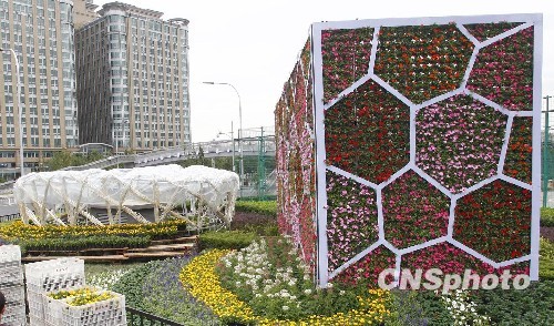 9月8日,北京东单路口处摆放着“鸟巢”和“水立方”国庆花坛,扮靓长安街。“十一”期间,长安街沿线将摆放22个造型别致的大型立体花坛,为长安街沿线增添喜庆气氛。