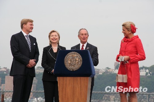 9月8日,纽约市以二十一响礼炮隆重迎接来自荷兰的船队,以庆祝哈德逊船长带领的荷兰船队发现纽约四百周年。图中从左到右:荷兰王储亚历山大、美国国务卿希拉里·克林顿、纽约市长彭博、荷兰王妃马克西姆在庆典仪式上。中新社发 魏晞 摄